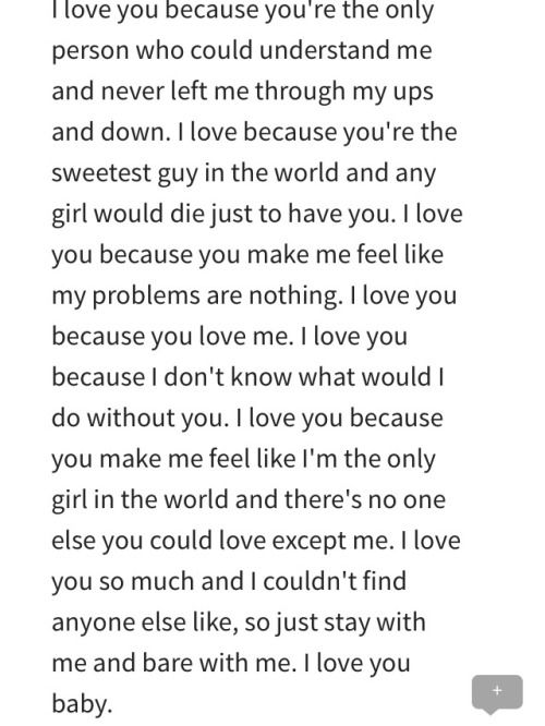 I want to thank you for everything and for so much that you have done for me, you show me your love in a special way that makes my heart beat to the point that I feel it will leave my chest. Remember that you are the love of my life and that you can always count on me. You are the person that I had waited for so long and now that I have you I will take care of you.