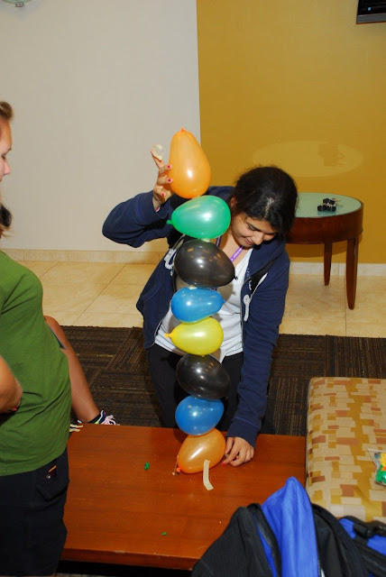 The children get a lot of inflated balloons, double-sided tape, scissors, and string and get the task is to build a tower or building as high as you can make possible.